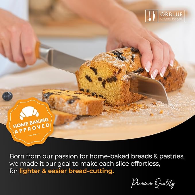 • ULTRA-SHARP, CUTS EFFORTLESSLY: The Orblue Serrated Bread Knife blade has an ultra-sharp serrated edge that grips and effortlessly slices the toughest loaves of bread, to provide a smooth, clean cut. The blade runs 8 inches long with a 4.9 inch handle. Included as an added safety measure on the knife’s sharp tip is a rubber safety guard.