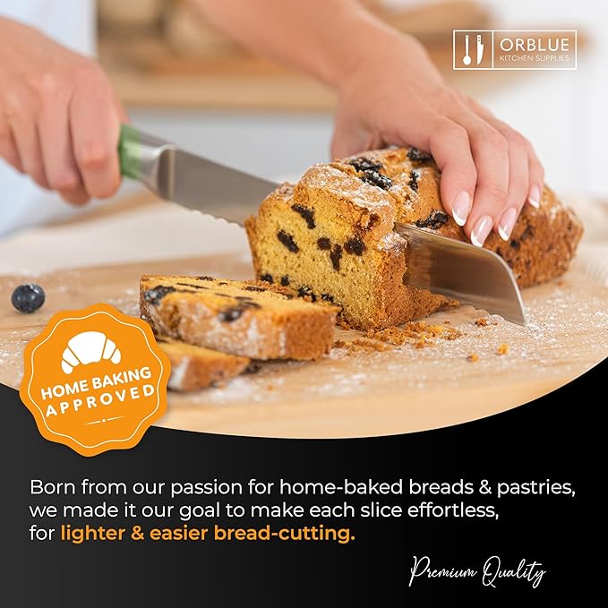Orblue Serrated Bread Knife with Upgraded Stainless Steel Razor Sharp Wavy Edge Width - Bread Cutter Ideal for Slicing Homemade Bread, Bagels, Cake (8-Inch Blade with 5-Inch Handle) Green