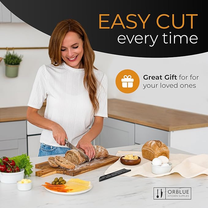 • ULTRA-SHARP, CUTS EFFORTLESSLY: The Orblue Serrated Bread Knife blade has an ultra-sharp serrated edge that grips and effortlessly slices the toughest loaves of bread, to provide a smooth, clean cut. The blade runs 8 inches long with a 5-inch handle. Included as an added safety measure on the knife’s sharp tip is a rubber safety guard.