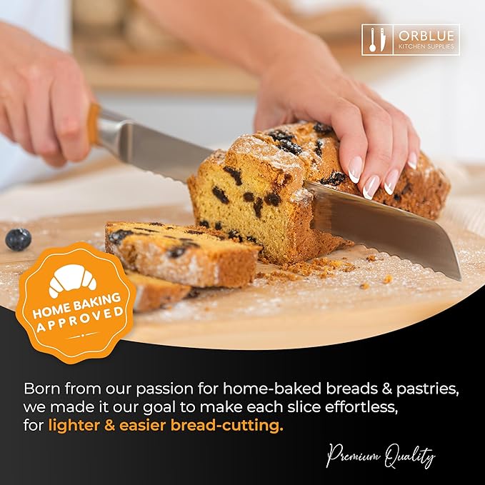 • SLEEK ERGONOMIC DESIGN: The bread knife for homemade bread was ergonomically designed with careful attention to detail, so you can slice comfortably and easily. The handle is made to perfectly fit any grip, making slicing harder loaves a breeze.