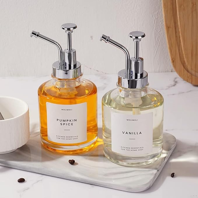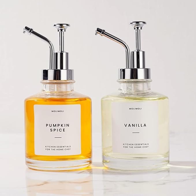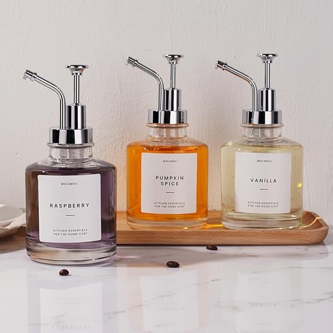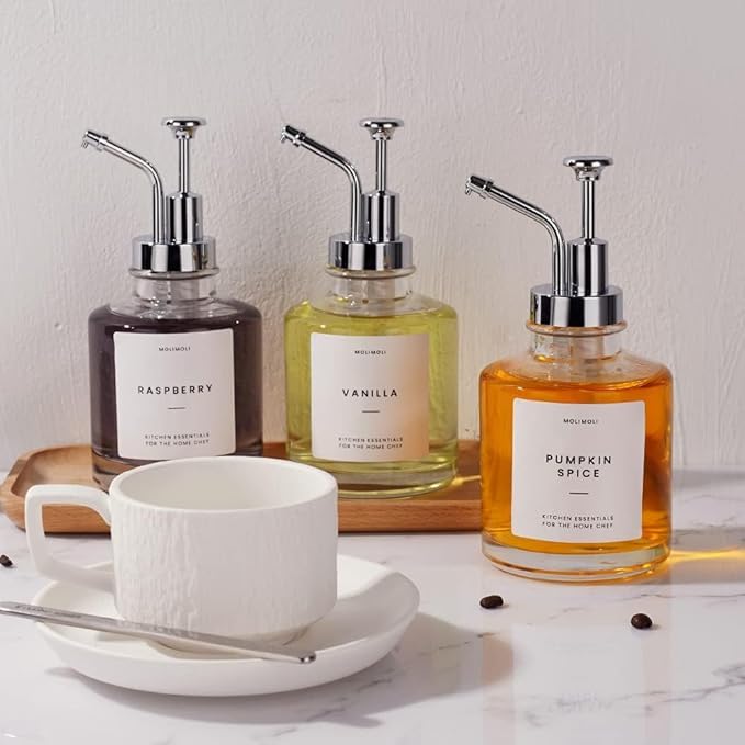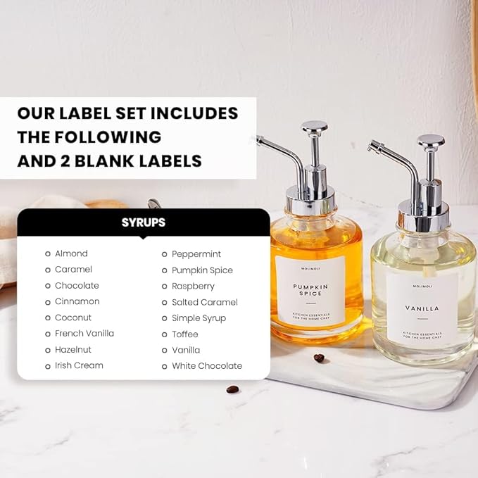 • Coffee Syrup Label Included: Every syrup dispenser set includes a package of custom-designed coffee syrup labels and two blank labels to keep your kitchen organized .