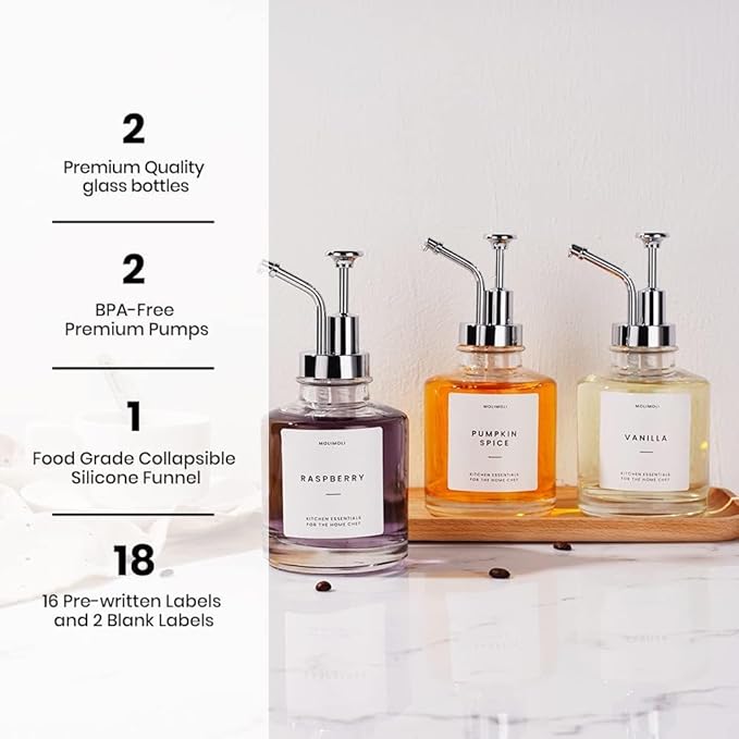 • Molimoli Syrup Dispenser Set: Each Set includes two custom-made high quality coffee syrup bottles, two PVC silver pumps, a funnel and a prefixed label set.
