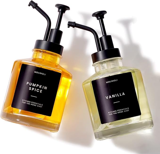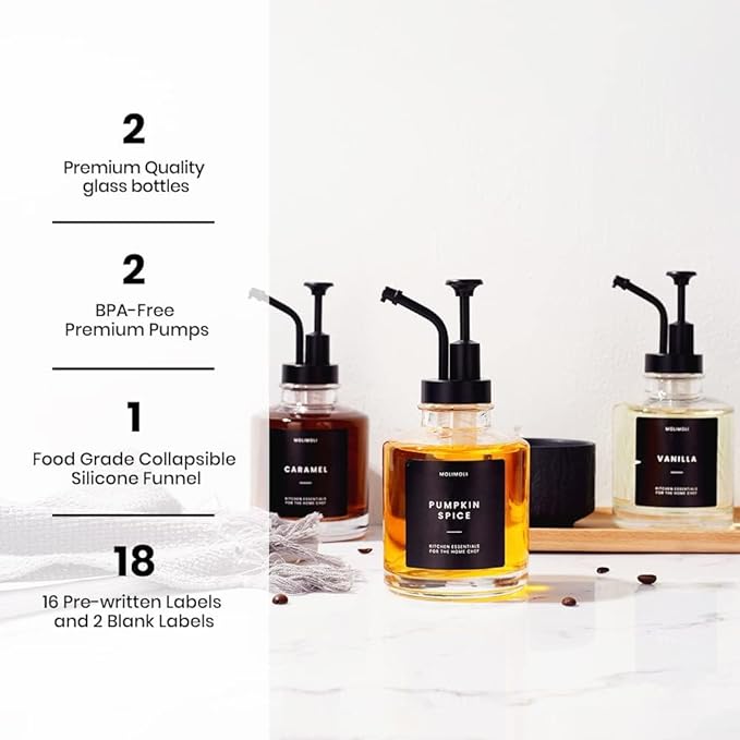• Molimoli Syrup Dispenser Set: Each Set includes two custom-made high quality coffee syrup bottles, two PVC black pumps, a funnel and a prefixed label set.