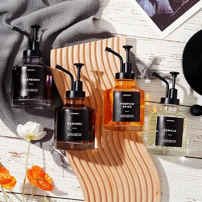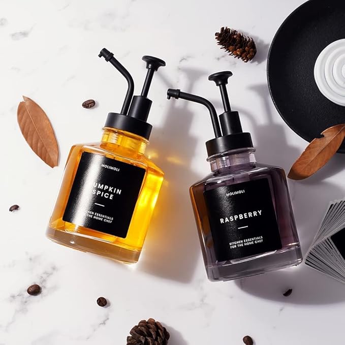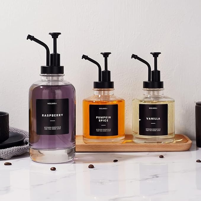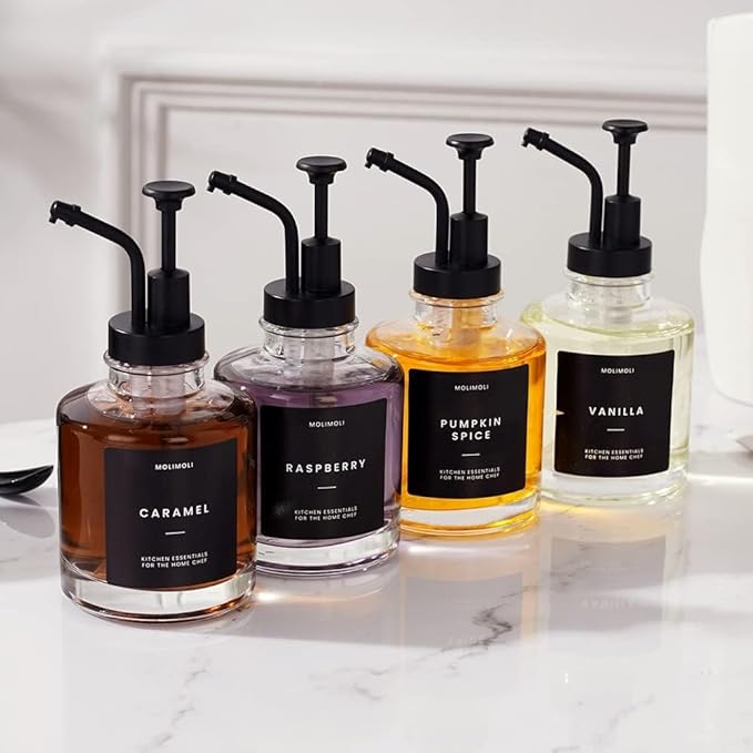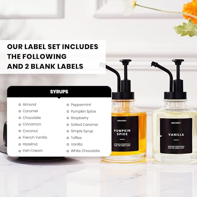 • Coffee Syrup Label Included: Every syrup dispenser set includes a package of custom-designed coffee syrup labels and two blank labels to keep your kitchen organized .