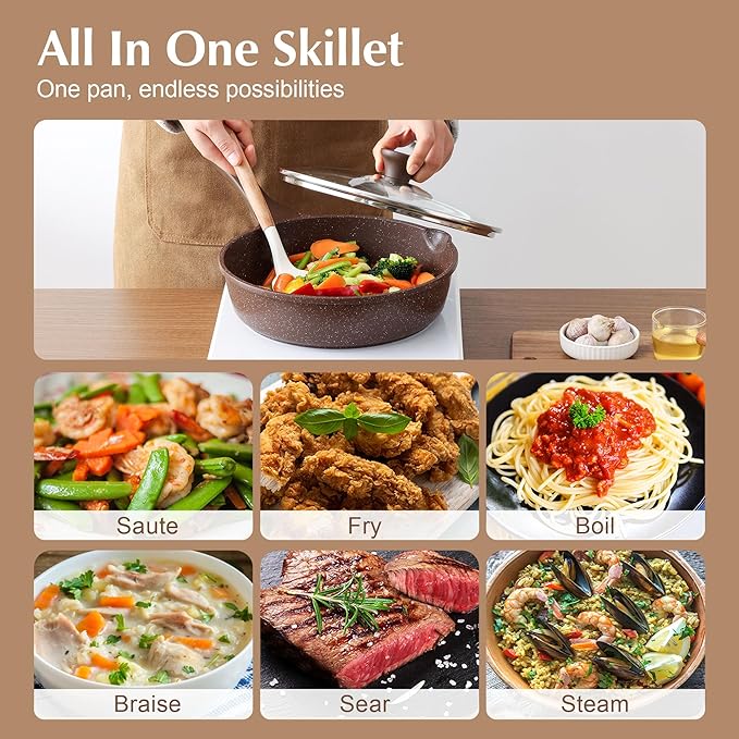 • Suitable for All Stoves – The high-magnetic-conductivity stainless steel base ensures compatibility with all cooktops, including induction. The frying pan features a sturdy die-cast aluminum core for fast, even heating.