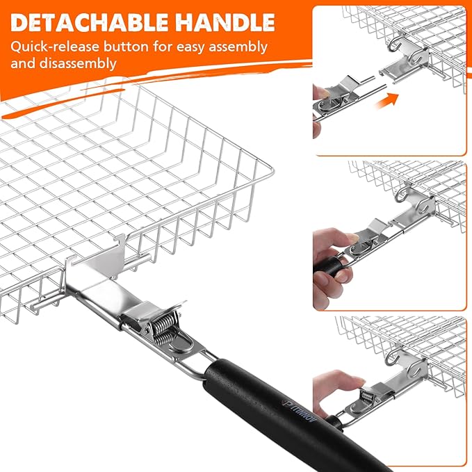 • 🔥【Removable Wooden Handle】 - Each fish grilling basket features a detachable wooden handle for easy handling and storage. The handle provides a safe, comfortable grip, keeping you safe from the heat of the grill while not interfering with the grill lid.
