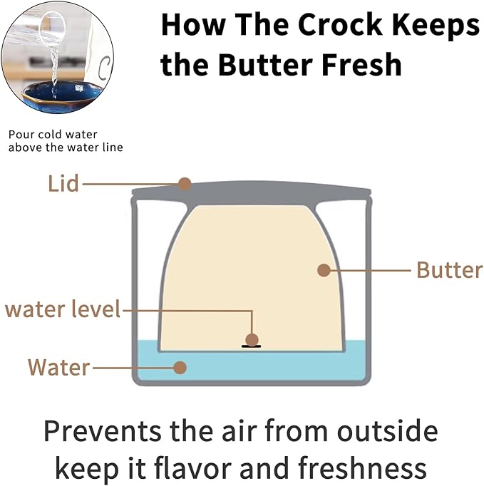 • French Butter Dish Preserve Freshness:The butter located in the top section of the crock has a natural water seal that guards against dust particles, insects, and bacteria in the air, maintaining its freshness in the butter bowl, without using your refrigerator.
