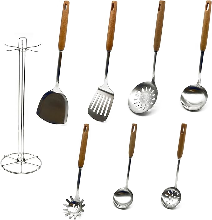 Cooking Utensils Set, 8-Piece 304 Stainless Steel Kitchen Tool Sets with Holder, Wooden Handle Heat Resistant Kitchen Cookware Set, Gadgets Tools Set Gift