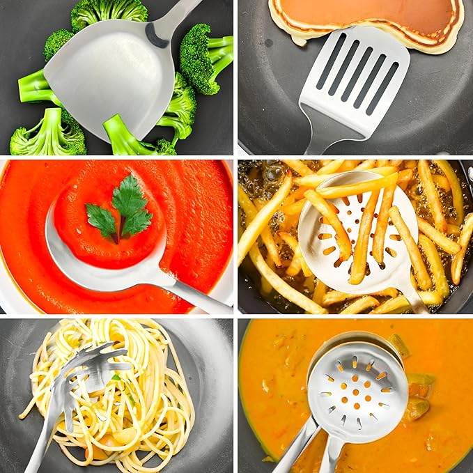 • Premium stainless steel construction ensures durability and rust resistance, delivering long-lasting performance. Food-grade and safe for daily use, these utensils won't dent, crack, or chip, making them a good choice as your cooking helper.