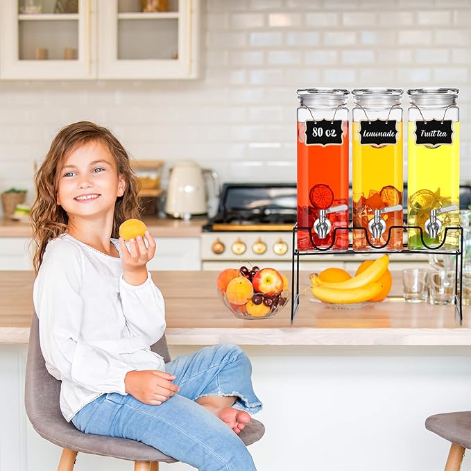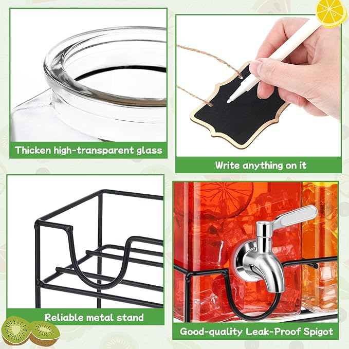 • Complete Drink Dispenser Set: you will receive 3 pieces of glass water dispenser, 3 glass lids, 3 stainless steel spigots, 1 black metal stand, 3 hanging chalkboard labels, 1 wrench, and 1 installation instruction, including the things you need to serve your favorite beverages; With the necessary accessories, you can start using it to sharing happiness with your partners and family