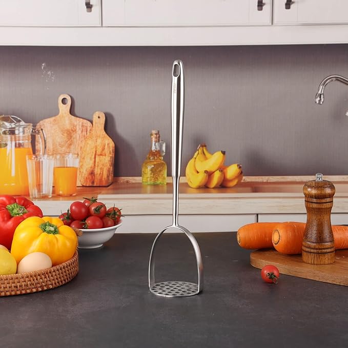 • 【12-Pieces Utensils Set】: 1 potato masher, 2 tongs(9.4in, 11.2in), 1 meat fork, 1 solid serving spoon, 1 slotted serving spoon, 1 spatula, 1 skimmer spoon, 1 slotted spatula tunner, 1 soup ladle, 1 spaghetti spoon, 1 large spoon. Fine matte brushed, silky smooth surface, giving your kitchen the finishing touch