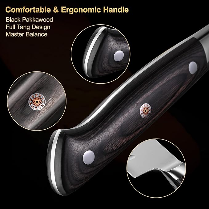 - ERGOMOMIC BLACK PAKKA WOOD HANDLE: The gyuto chef knife's handle is crafted from Pakka Wood, a material renowned for its strength, comfort, and stability. This ensures a professional touch and minimizes any potential fatigue, finger numbness, or discomfort that may arise from prolonged use.The ergonomic design provides optimal balance between the handle and the slender blade, ensuring effortless maneuverability