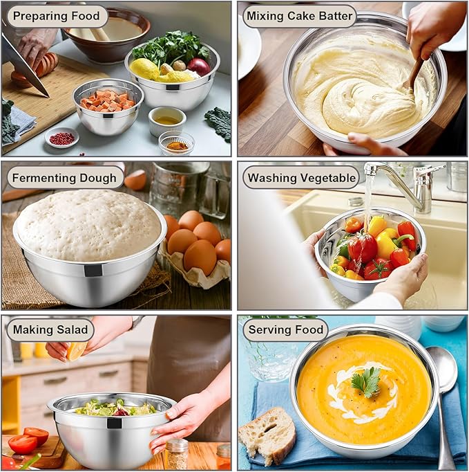 - 【Keep Food Fresh】Each mixing bowl come with well-matched lid, Could close snugly on the bowl to create an airtight storage container, Easy to keep your food fresh and dry, Suitable to store leftovers in refrigerator or store your leftover snacks, Also protect your food against dust and avoid the food leaking, Lightweight enough is convenient to transport on camping and picnic, 6 Different sizes could meet your storage requirements for multiple capacity
