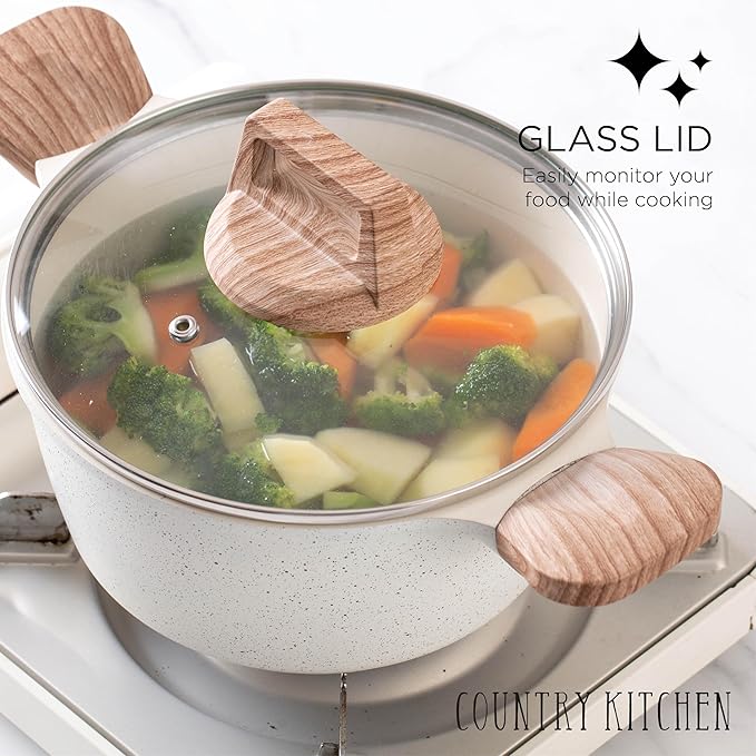 • SET INCLUDES - A complete kitchen essentials set, you're getting a total of 10 cookware pieces and 4 silicone utensils. Including an 3 qt casserole pot with glass lid, a 4 qt casserole pot with glass lid, a steamer, an 11” frying pan, an 8” frying pan, a 11" deep frying pan with glass lid, and a 2 qt sauce pan with glass lid. These beautiful cookware sets are designed with a speckled coating and woodlike handle. Not only functional, but these sauté pans are decorative as well.