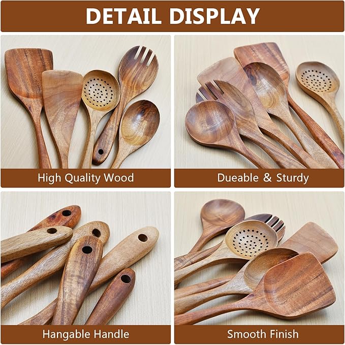 • 【Heat Resistant and Non-Stick】Teak wood has a tight grain and high organic oil content,which makes it one of the hardest woods.You don't have to worry about it falling on the floor and breaking or scratching.The wooden cooking spoon set is super heat resistant,won't melt or deform due to high temperatures like rubber cookware,and is well insulated to prevent burning hands.These kitchen wooden spoons can be used in any utensils or cookware and are harmless to the human body.