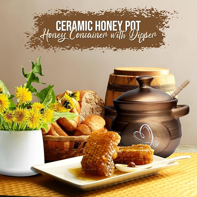• ๐——๐—ฟ๐—ถ๐˜‡๐˜‡๐—น๐—ฒ ๐—ช๐—ถ๐˜๐—ต๐—ผ๐˜‚๐˜ ๐˜๐—ต๐—ฒ ๐— ๐—ฒ๐˜€๐˜€: The honey dispenser has a perfectly sized diaper that makes drizzling honey a breeze. No more sticky spills! Ideal for use on toast, tea, or desserts, this ceramic jar with lid ensures clean, controlled dispensing every time. Enjoy easy, mess-free drizzling.