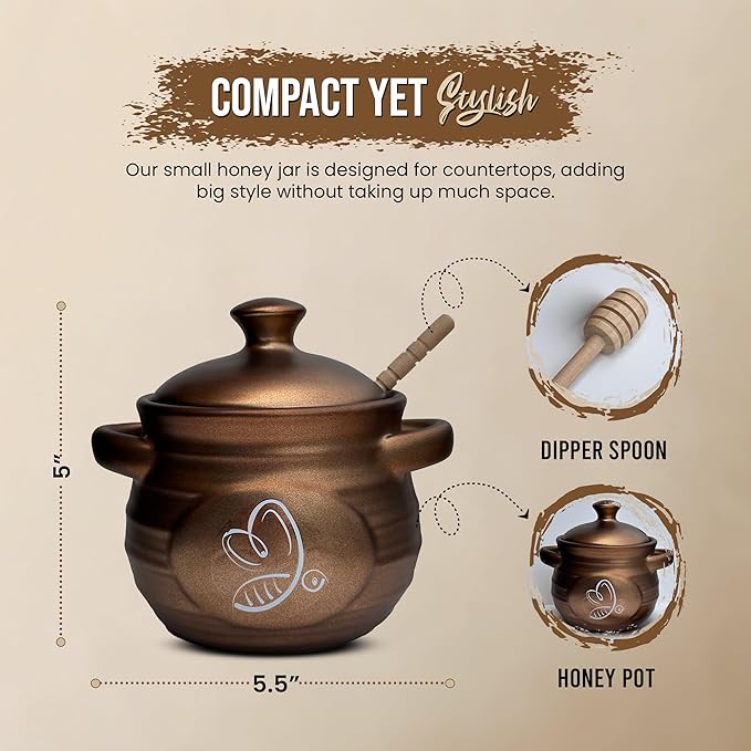• ๐—–๐—ผ๐—บ๐—ฝ๐—ฎ๐—ฐ๐˜ ๐—ฌ๐—ฒ๐˜ ๐—ฆ๐˜๐˜†๐—น๐—ถ๐˜€๐—ต: Our small honey jar is designed for countertops, adding big style without taking up much space. Its 5" height & 5.5" width makes it an eye-catching and practical addition to any kitchen, combining utility with the elegance of decorative jars with lids. Small size, significant impact.