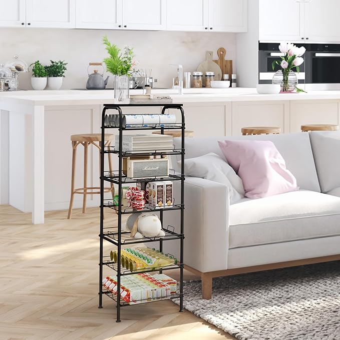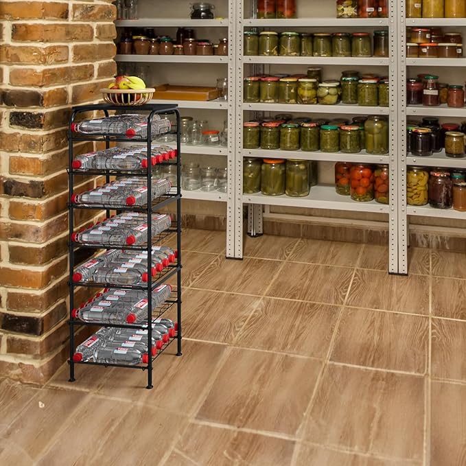 • 【Size & Material】This drink organizer measures 13.3"L*13.2"W*43.3"H, 7 tiers in total, each tier can hold 5-10 mineral water bottles or at least 10 cans. And this water bottle storage rack is also made of high quality metal with anti-rust coating for durability, and each metal bar is welded firmly to each other.