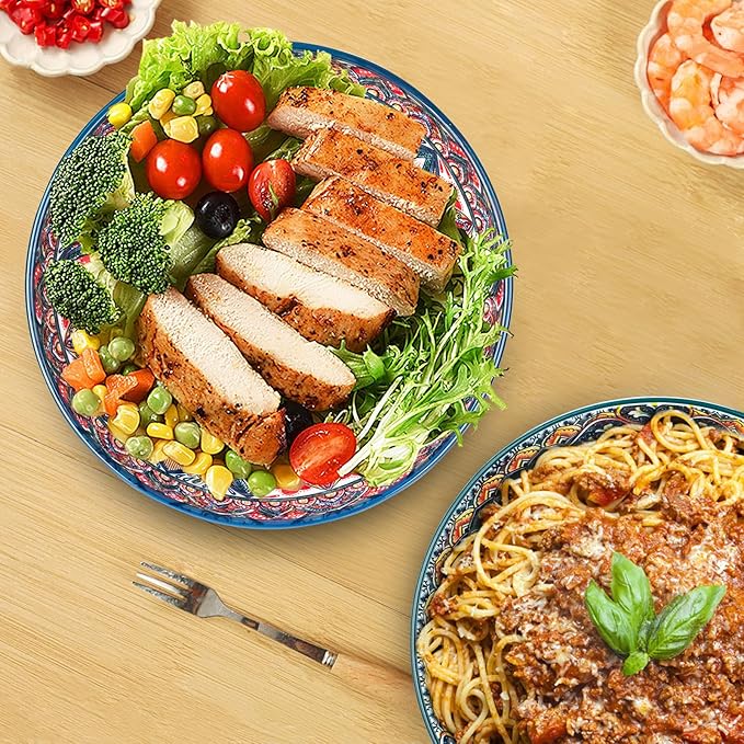 • Easy Maintenance and Cleaning: Fired at high temperatures to maximize the strength of the porcelain, The Ultra-durable glaze is sufficient to resist the scratches of the knives and forks at 1000 grams of pressure, won't absorb stains, ensuring that they look great and maintain their bright colors over time,The smooth glaze on the plates makes them easy to clean, either by hand or in a dishwasher.