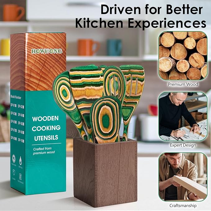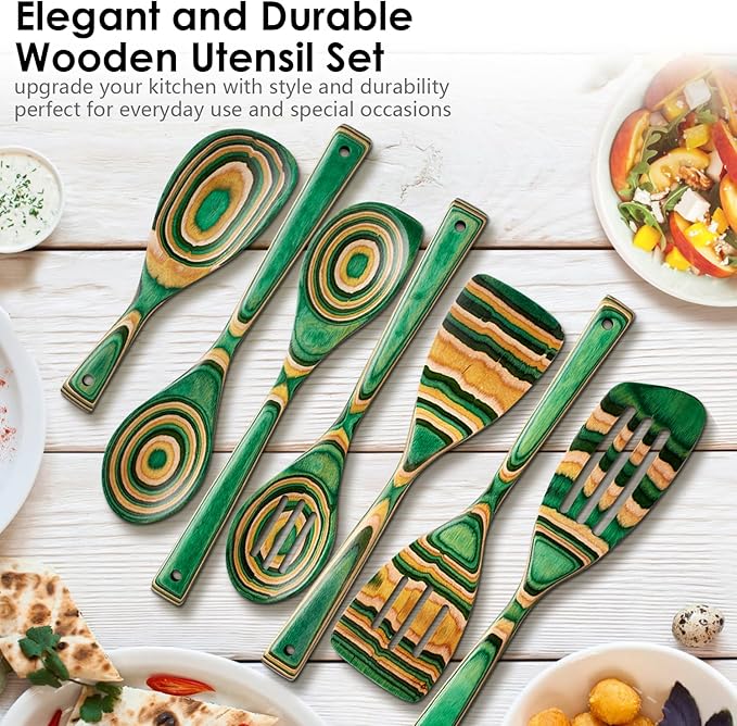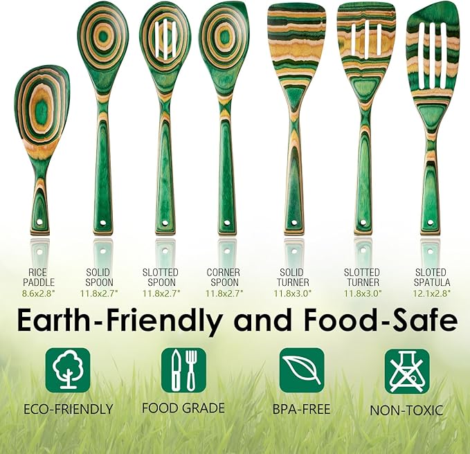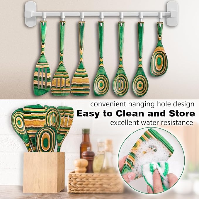 • UNIQUE OASIS DESIGN: Pakkawood utensils feature a refreshing green Oasis pattern, blending style and durability for everyday cooking and serving tasks.
