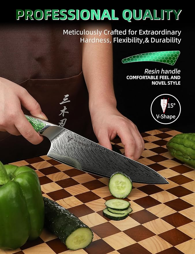 8 inch Chef Knife, Japanese VG-10 Damascus Steel Kitchen Knife, Ultra Sharp Cooking Knife with Full-tang Handle in Green Resin, LA-S9 Series