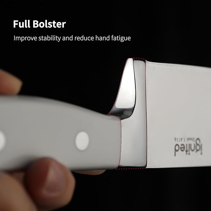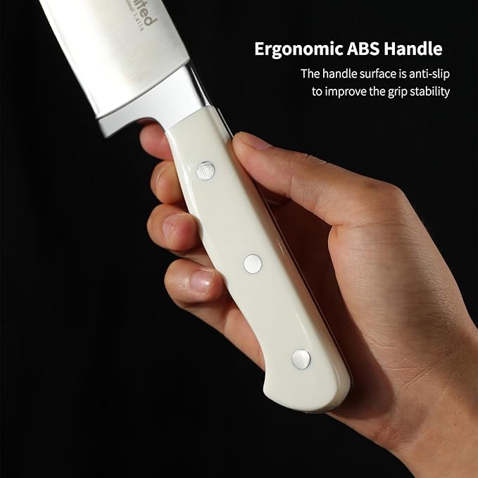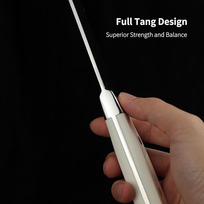 • Pure White Handle - White ABS handle is simple, beautiful and fresh. And it is comfortable to hold and non-slip, easy to wash and clean. Thick and sturdy bolster and finger guards minimize fatigue and avoid damage to fingers. The weighted knife butt keeps the weight well balanced.