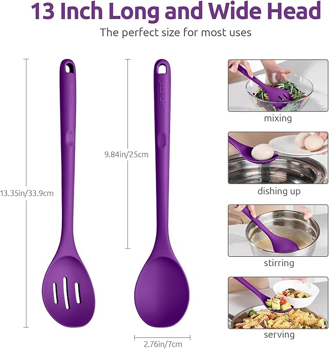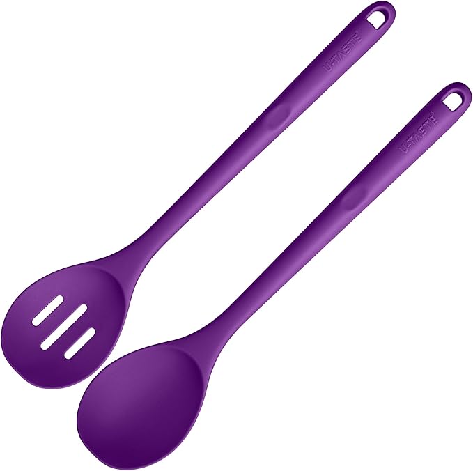 600ºF Heat Resistant Silicone Spoons: U-Taste 13.3in Solid & Slotted Kitchen Cooking Spoon, Nonstick Food Grade Long Rubber Utensil, Sturdy for Mixing, Serving, Frying, Draining (Purple, 2PCS)