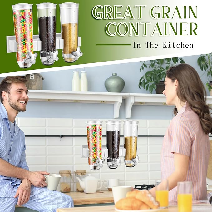 • Multiple Applications: this wall mounted dry food dispenser is helpful for storing and dispensing cereal, candy, nuts, coffee, beans, rice, grain, oatmeal, tea, snacks and more, avoiding messing up and keeping your kitchen neat