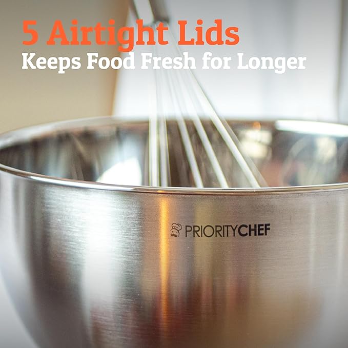 Priority Chef Premium Mixing Bowls With Airtight Lids Set, Thicker Stainless Steel Mixing Bowl Set, Large Prep Metal Bowls with Lids, Nesting Bowls for Kitchen, 1.5/2/3/4/5 Qrt, Khaki