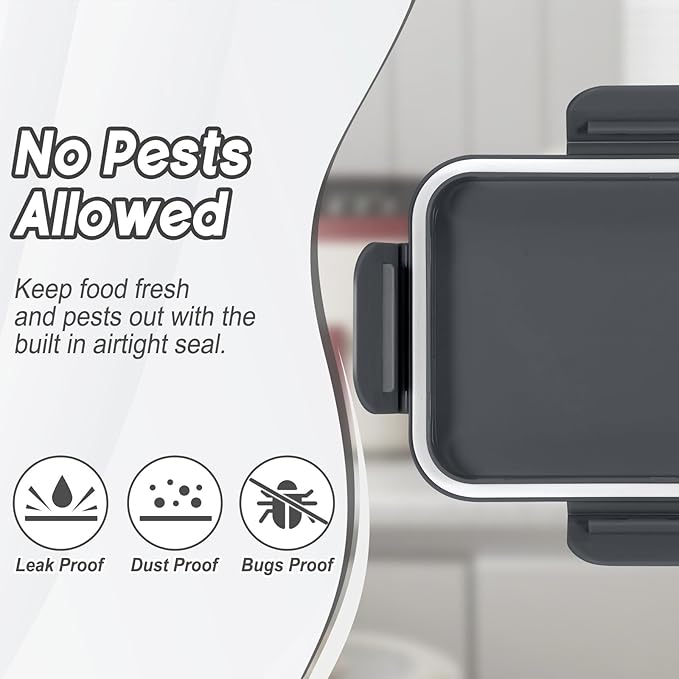 • FUNCTION : This airtight dog food container with portable handle has an airtight design,has 2 silicone seals and 4 sealing buckles,which can keep your food dry and fresh, the portable handle and large spout design can easily Easily pours food out,also perfect for traveling, hiking, camping or picnicking with your dog