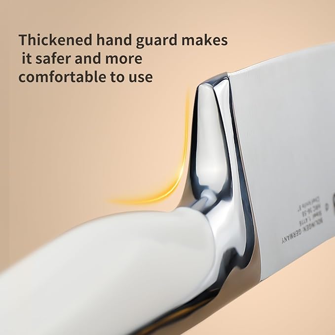 • Elegant White ABS & Stainless Steel Handle: The handle is ergonomically designed with a combination of white ABS and stainless steel, providing a comfortable and secure grip. Its sleek and modern design not only looks great in any kitchen but also ensures optimal balance and control.