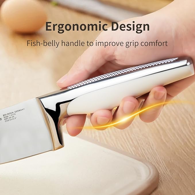 • Premium German High Carbon Stainless Steel: Crafted from German 1.4116 high carbon stainless steel, this 8-inch chef knife offers exceptional durability, rust resistance, and long-lasting sharpness. Perfect for both professional chefs and home cooks, it ensures precise and effortless cutting every time.