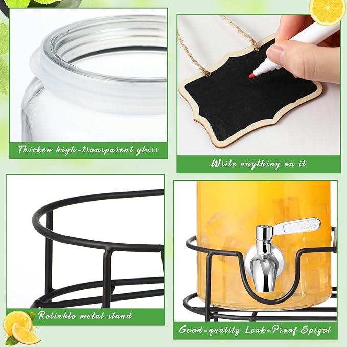 • Complete Drink Dispenser Set: you will receive 3 pieces of glass water dispenser, 3 glass lids, 3 stainless steel spigots, 1 black metal stand, 3 hanging chalkboard labels, 1 wrench, and 1 installation instruction, including the things you need to serve your favorite beverages; Once you have the required accessories, you may begin utilizing it to spread joy among your loved ones
