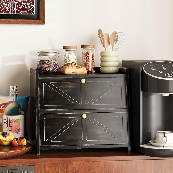 • Large Capacity:Our bread box with 2 layers of 15.8”L x 9.8”W x 13.8”H board are large enough to hold 2 large loaves of bread, rolls, muffins, and more. Flat top design,any kitchen items you want can be placed on the bread box. It can meet the needs of your family.