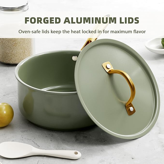 • TOXIN-FREE: This pots and pans set's healthy ceramic nonstick coating is free of PFAS, PFOA, lead, and cadmium, making them safe for you, your family, and the environment.