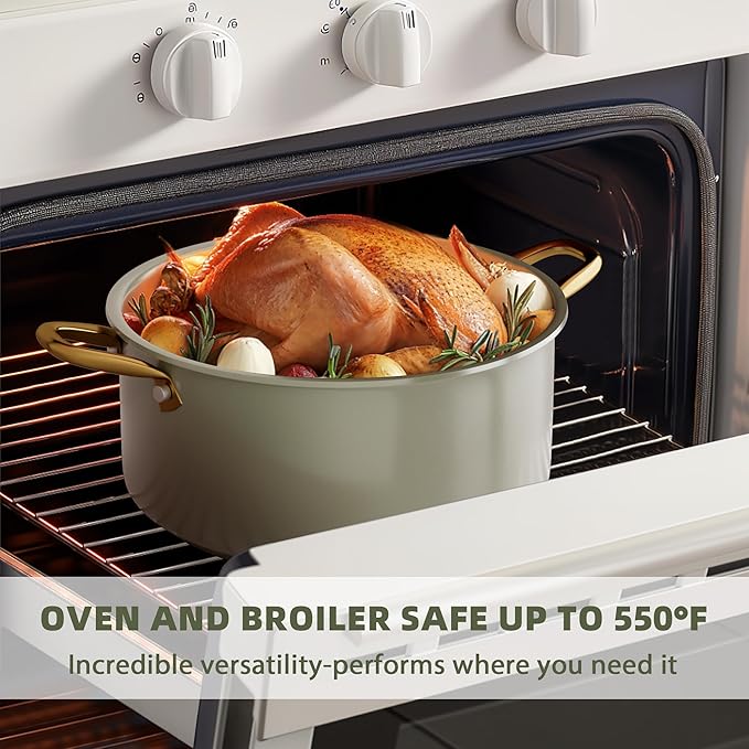 • FOR ALL STOVETOP & OVEN SAFE: The innovative induction base delivers uniform heat distribution on all cooktops, induction, gas, electric, halogen or ceramic. Plus, oven safe up to 550°F, making the non stick pots and pan set great for bread baking and roasts.