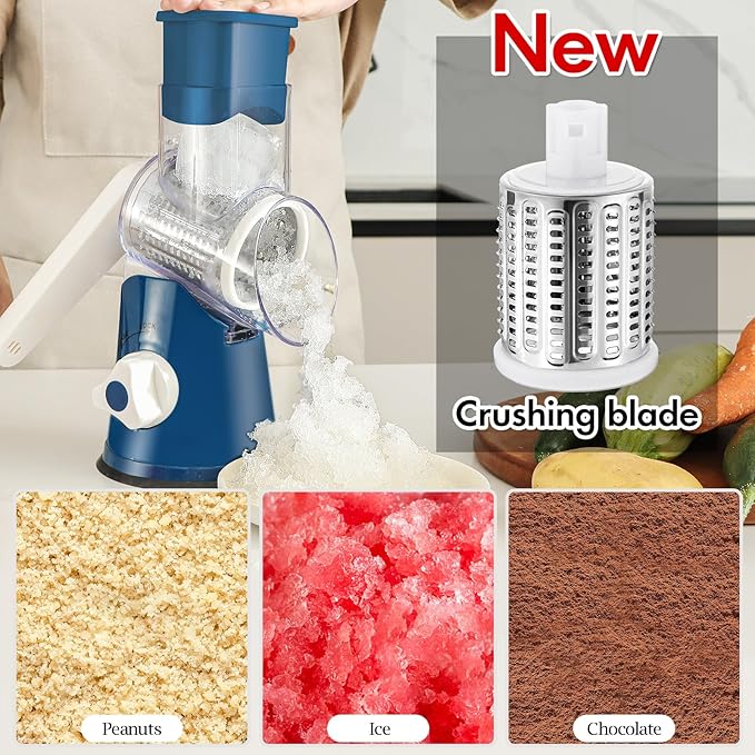 Ourokhome Rotary Cheese Grater Hand Crank, Kitchen Shredder Speed Mandolin Slicer Ice Shaver with Handle and Drum Blades for Cheese, Vegetable, Nuts, Chocolate, Potato, Carrot, 5 Blades, Dark Blue