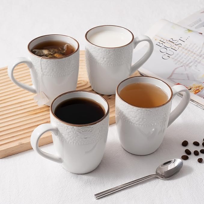 • 【Coffee Mugs Set of 4】This set of 12oz coffee mugs features exquisite pattern designs and comes with a sturdy handle, ensuring a firm grip when in use. The stable base design is suitable for various surfaces, effectively reducing the risk of spills