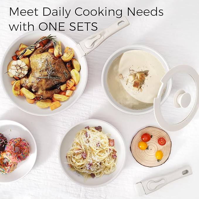 - Space-Saving Design – Detachable handles pots and pans sets allow for compact nesting, optimizing 75% kitchen cabinet space and providing a healthy cooking environment,making for easy storage in cabinets or RVs.