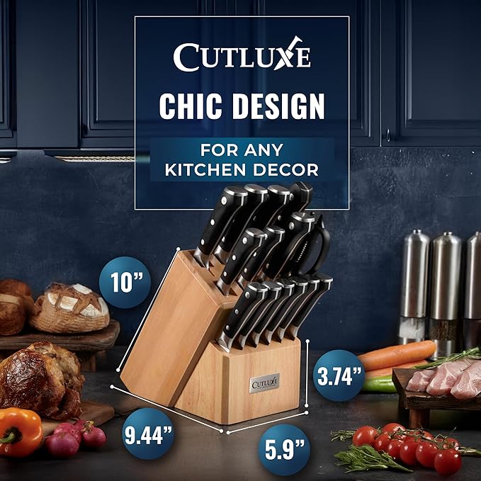 Cutluxe 15-Piece Knife Set – Premium Rubberwood Wood Block – Knife Set for Kitchen, Ultra Sharp High Carbon German Stainless Steel, Full Tang – Artisan Series