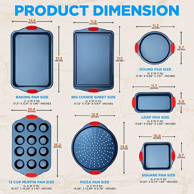 • COMPLETE BAKING SOLUTION – This 8-piece set is ideal for baking cakes, muffins, cookies, and more. Includes a roaster pan, pizza, pan, round pan, square pan, loaf pan, big cookie sheet, and a 12-cup muffin pan, covering all your baking needs in one set.