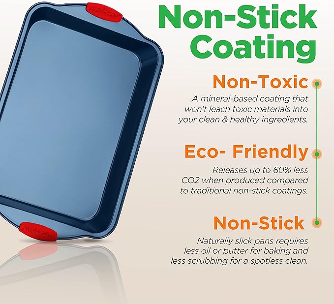 • DELUXE NONSTICK BAKEWARE – Elevate your baking with this bakeware set, featuring stylish blue silicone coating and red silicone handles. Perfect for both professional chefs and home bakers, ensuring effortless food release and even baking every time.