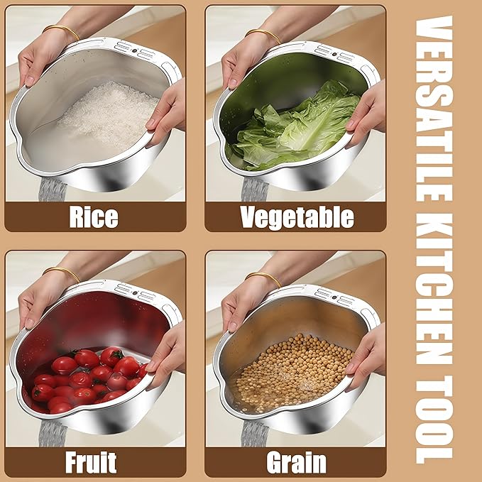 • 4 in 1 Fine Mesh Strainer Bowl: The colander strainer offers ample space for quick and efficient cleaning of rice, vegetables, fruits, or pasta.