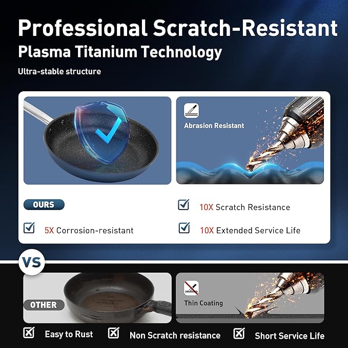 • 【Scratch-Resistant】: Titanium coating can withstand regular use and high temperatures without wearing off or losing its non-stick properties. Whatever cookware you use, we always recommend plastic, silicone, or wood utensils to prolong the lifespan of the cookware
