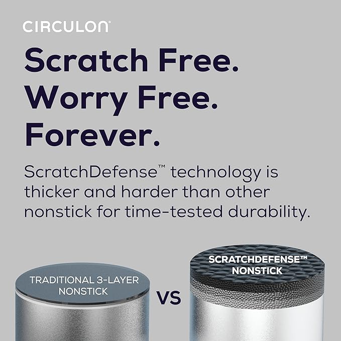 - SCRATCH FREE. WORRY FREE. FOREVER: Circulon’s patented ScratchDefense nonstick technology is our most advanced nonstick cooking surface and engineered not to scratch, ever.* It has been laboratory tested to last 130x longer than the competition—that’s more than 350,000 scrapes without scratching.