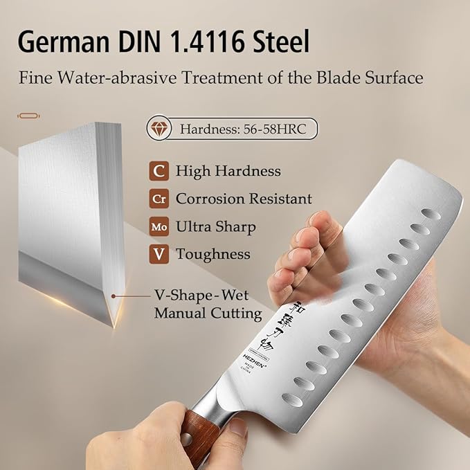 • [German 1.4116 Stainless Steel,Better Properties] The specific content of Cr, Mo, V and other metal elements inside the steel have good special properties. After vacuum heat treatment, the hardness can be up to 56-58 HRC, compared with ordinary stainless steel chopper, it has better corrosion resistance, rust resistance and stronger toughness.