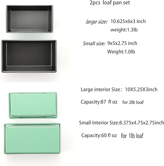 • COLORFUL DESIGN:The non-stick coating of the 2lb loaf bread baking pans is dark gray coating and the bottom is rosemary green. The colorful design of the standard loaf pans adds more delight to your kitchen.