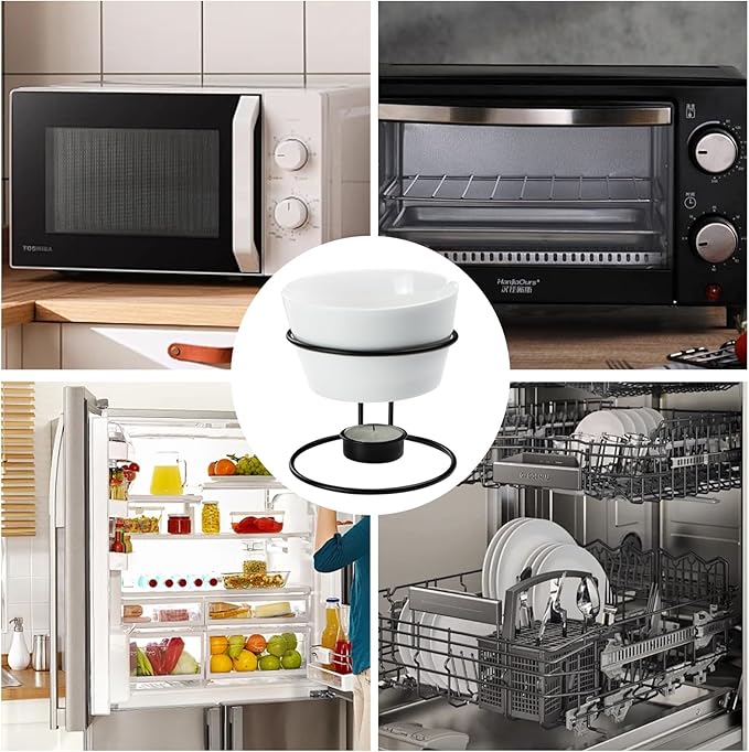 - 【Stability &Appropriate Temperature】Features sturdy wire frame that securely holds ceramic bowl in place,ensuring stability.This design offers enhanced stability compared to top support ring for suspending the ceramic bowl.There has been an adjustment in the tea-light candle placement to ensure an optimal distance from the flame to the ceramic bowl, providing gentle warmth and maintaining the butter at just the right temperature. Single-sided stands make it easier to light and extinguish candles.