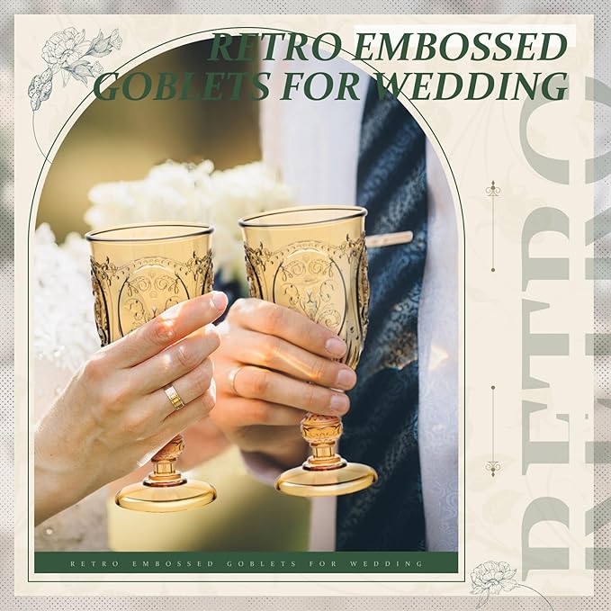 • Elegant Design: our vintage wine glasses set features a European vintage style and embossed design, comfortable to hold in the hand; Use our cups to sip your favorite drinks with your guests at your party and experience the irresistible vintage beauty, add a touch of romantic to your party and impress your guests