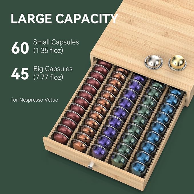 for Nespresso Vertuo Capsules (NV145) - Premium Bamboo Coffee Pod Drawer, 45 Big or 60 Small Vertuoline Pods Organizer - 13.25"Wx14"Dx3.9"H (Natural)